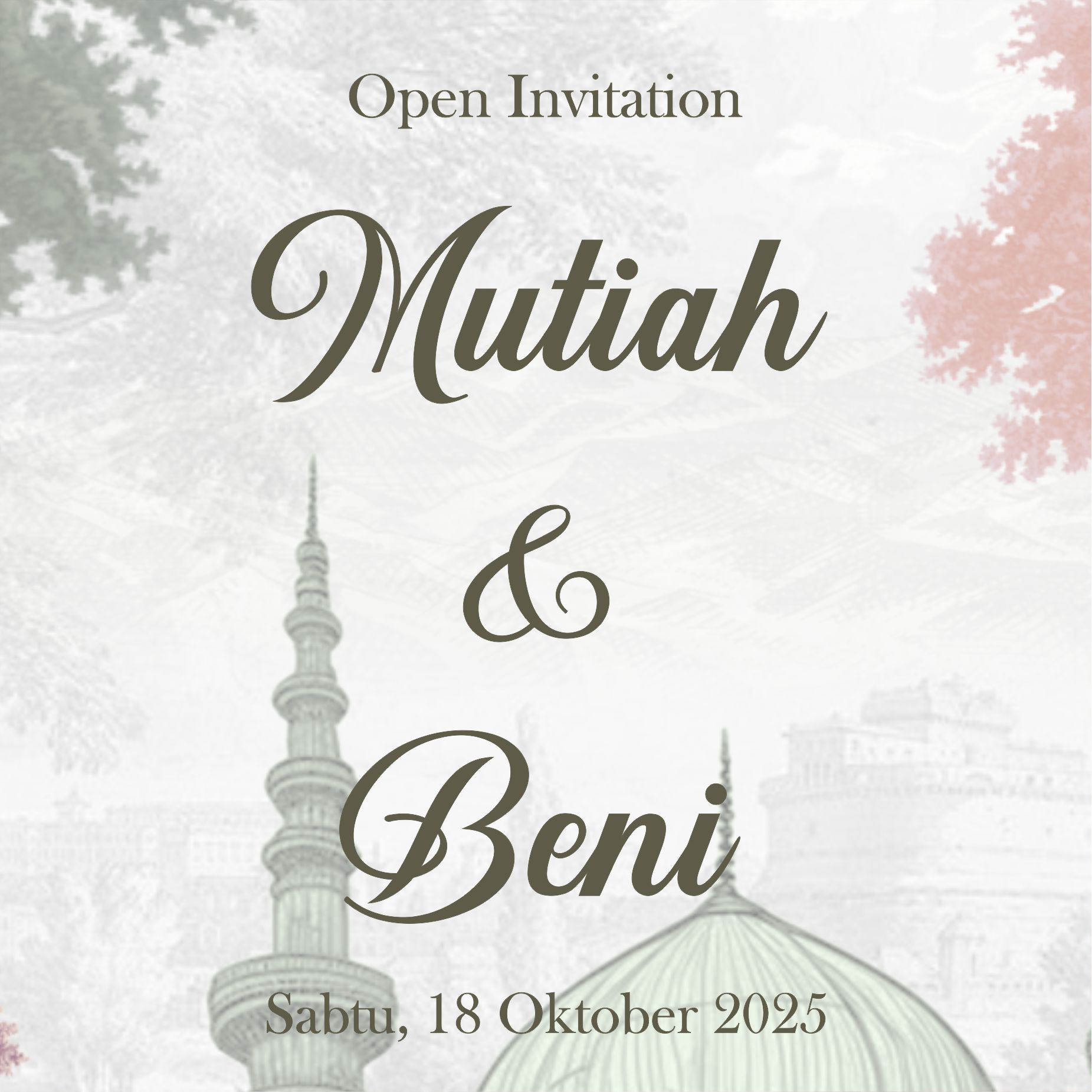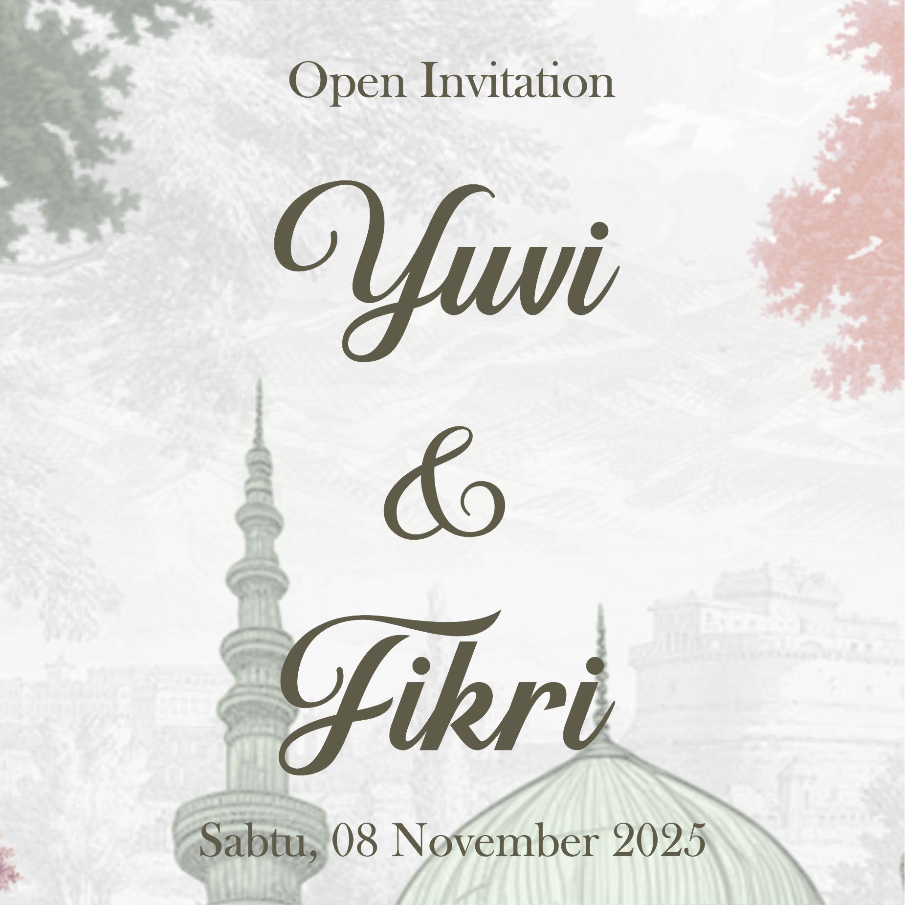 The Wedding Of Zahra & Ibnu You Are Invited Open Invitation Dan di antara tanda-tanda kekuasaan-Nya ialah Dia menciptakan untukmu isteri-isteri dari jenismu sendiri, supaya kamu cenderung dan merasa tenteram kepadanya, dan dijadikan-Nya diantaramu rasa kasih dan sayang. Sesungguhnya pada yang demikian itu benar-benar terdapat tanda-tanda bagi kaum yang berfikir. ( Ar-Rum Ayat 21 ) Save The Date 00Hari 00Jam 00Menit 00Detik We Are Getting Merried Fatimah Zahra Putri Dari Bapak Said Syahrizal & Ibu Read more